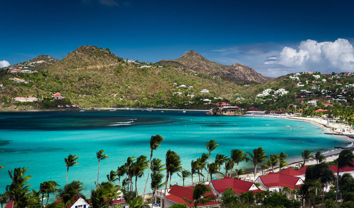 Contemporary style 2 bedroom, 2,5 bathroom, St Barths beachfront villa rental, fully air-conditioned, part of the "Coral Reef" gated residence with three equal and independent villas (Les Oiseaux, Les Poissons, Les Cocotiers) + a 4th one (Nina). The residence is located on the famous St Jean beach with a spectacular view on the bay. Each villa has a large terrace overlooking the beach, with lounge chairs.