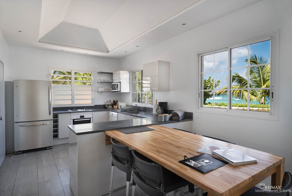 Fully equipped ocean view and air conditioned kitchen, with electric oven, gas stove, fridge and freezer with ice maker, dish washer, microwave, toaster, coffee machine, blender, table for 5 guests, mosquito screen. Service for 6. Charcoal BBQ by the ajoupa on the front terrace.
