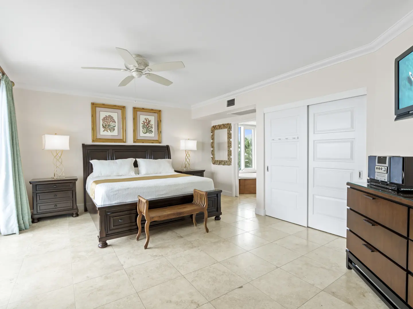 - Two Master Suites, one with a king bed and the second with two double beds offering premium bedding and linens, flat screen TV, DVD player, IPod ready clock radio and views of the ocean from the private balcony. Fully appointed in-suite, five fixture master baths. Granite-finished showers with frameless glass enclosures, double bowl sinks and two-person soaking tub.